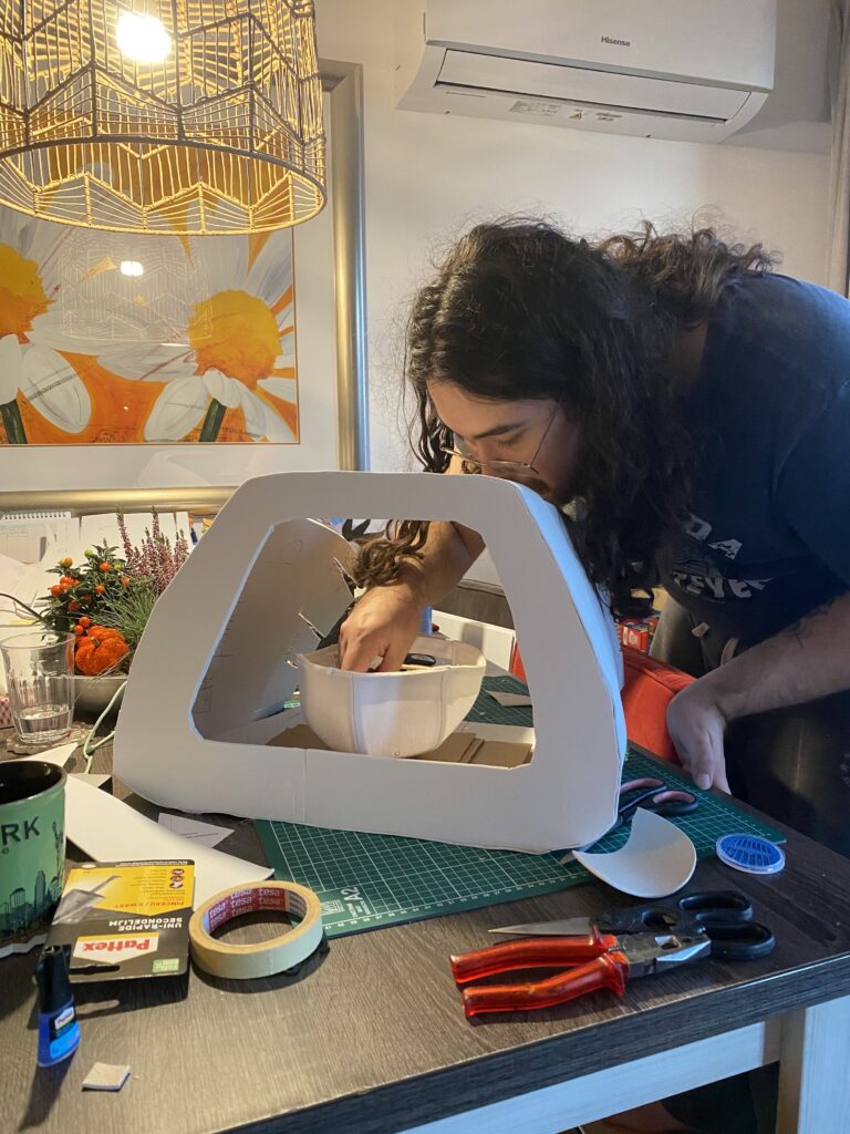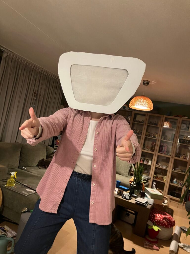 Daarna kon ik beginnen met het in elkaar zetten. Ik gebruikte een pet als helm zodat de tv-hoofd op mijn hoofd bleef zitten. Alle foam onderdelen maakte ik aan elkaar vast met een lijmpistool.