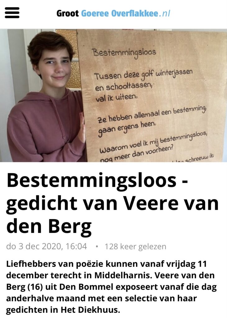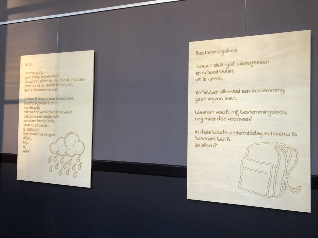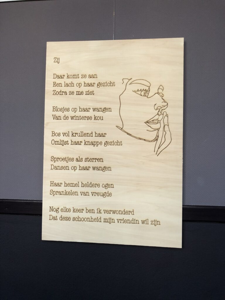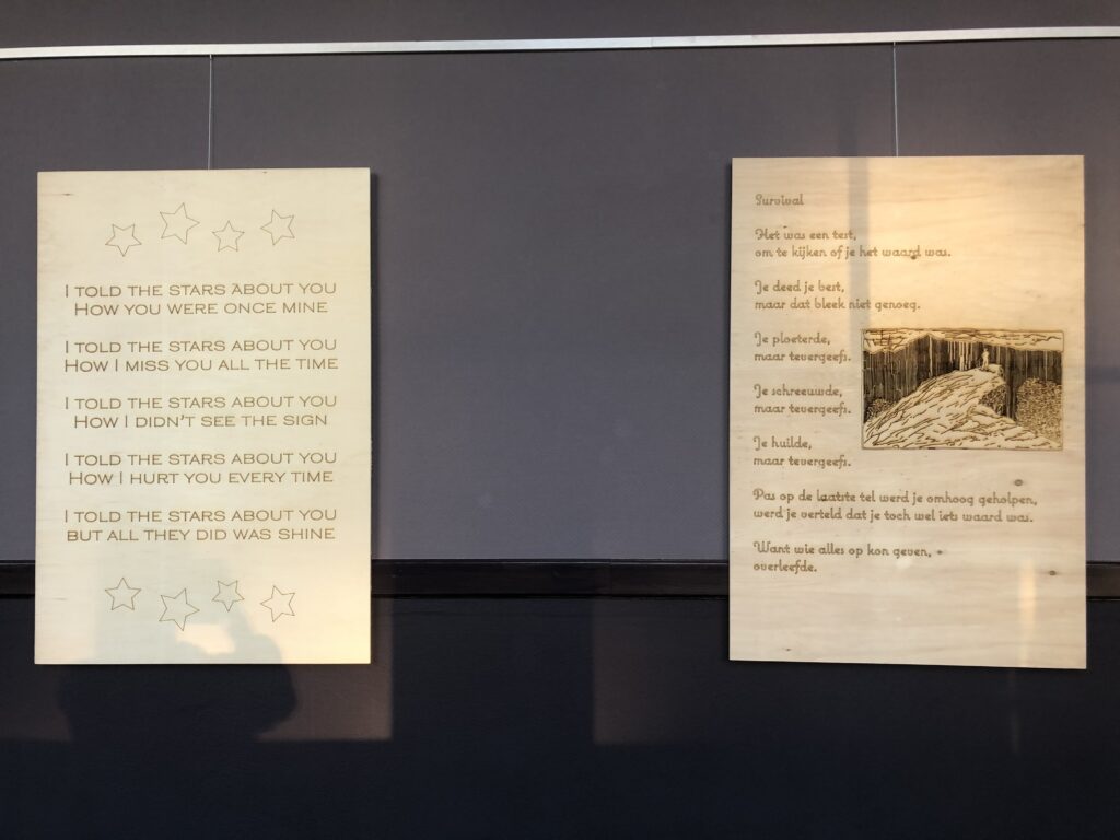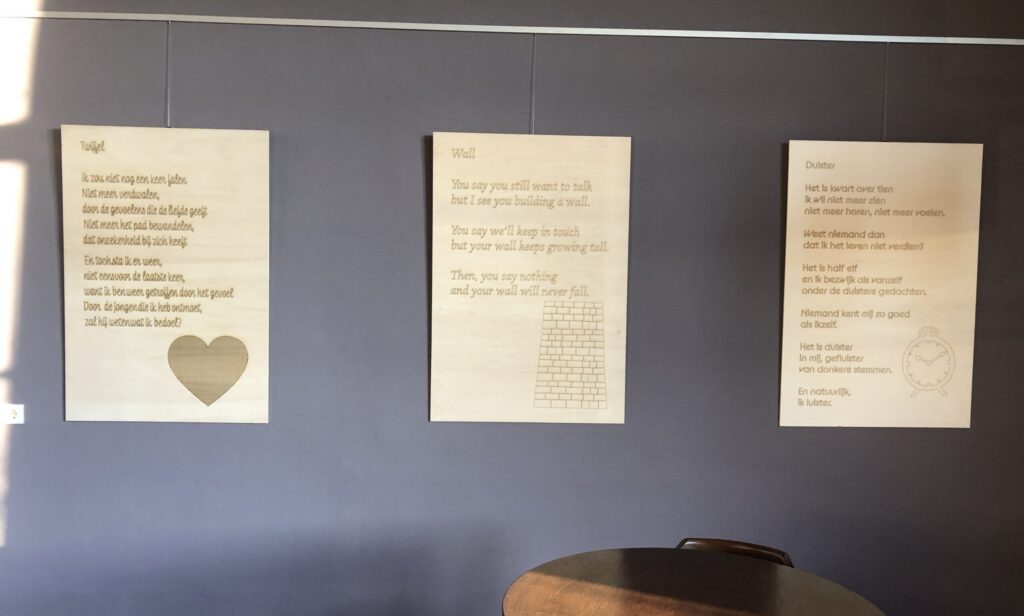 Voor mijn VWO profielwerkstuk organiseerde ik een poëzie tentoonstelling met 10 zelfgeschreven gedichten gelaserd op houten platen. De tentoonstelling vond plaats in Het Diekhuus in Middelharnis, een cultureel centrum.