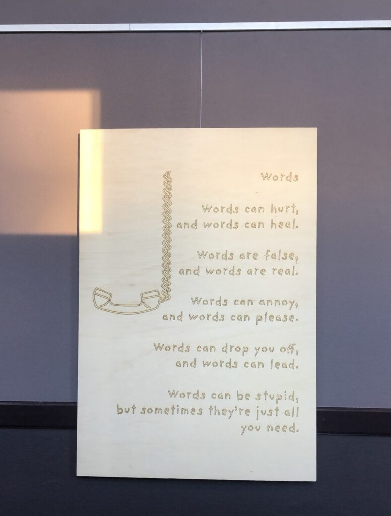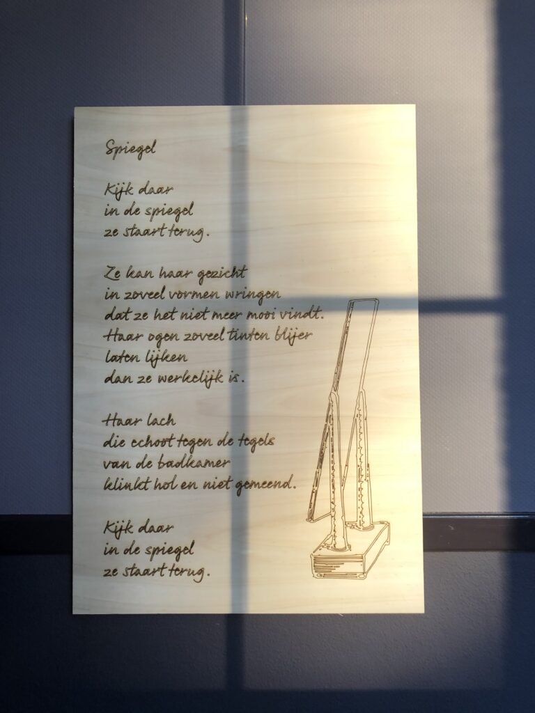 De gedichten zijn gelaserd met een lasermachine van FabLab, een digitale ontwerpwerkplaats in Bergen op Zoom. Eerst laserde ik een test op een houten plaat die ik nog had liggen. Daarna laserde ik de 10 gedichten op de platen. Elk gedicht is geschreven in een ander lettertype en heeft een bijpassende afbeelding.