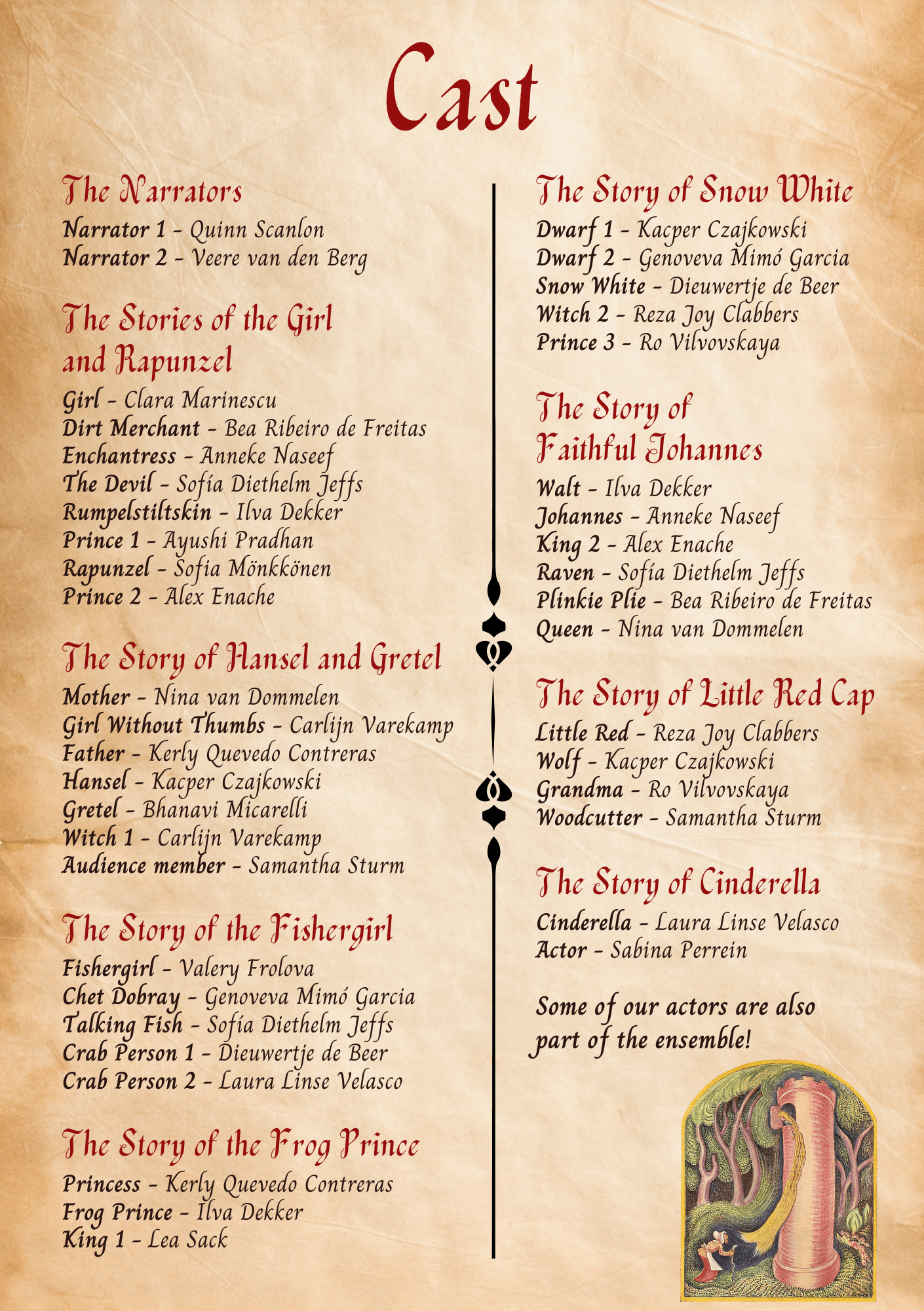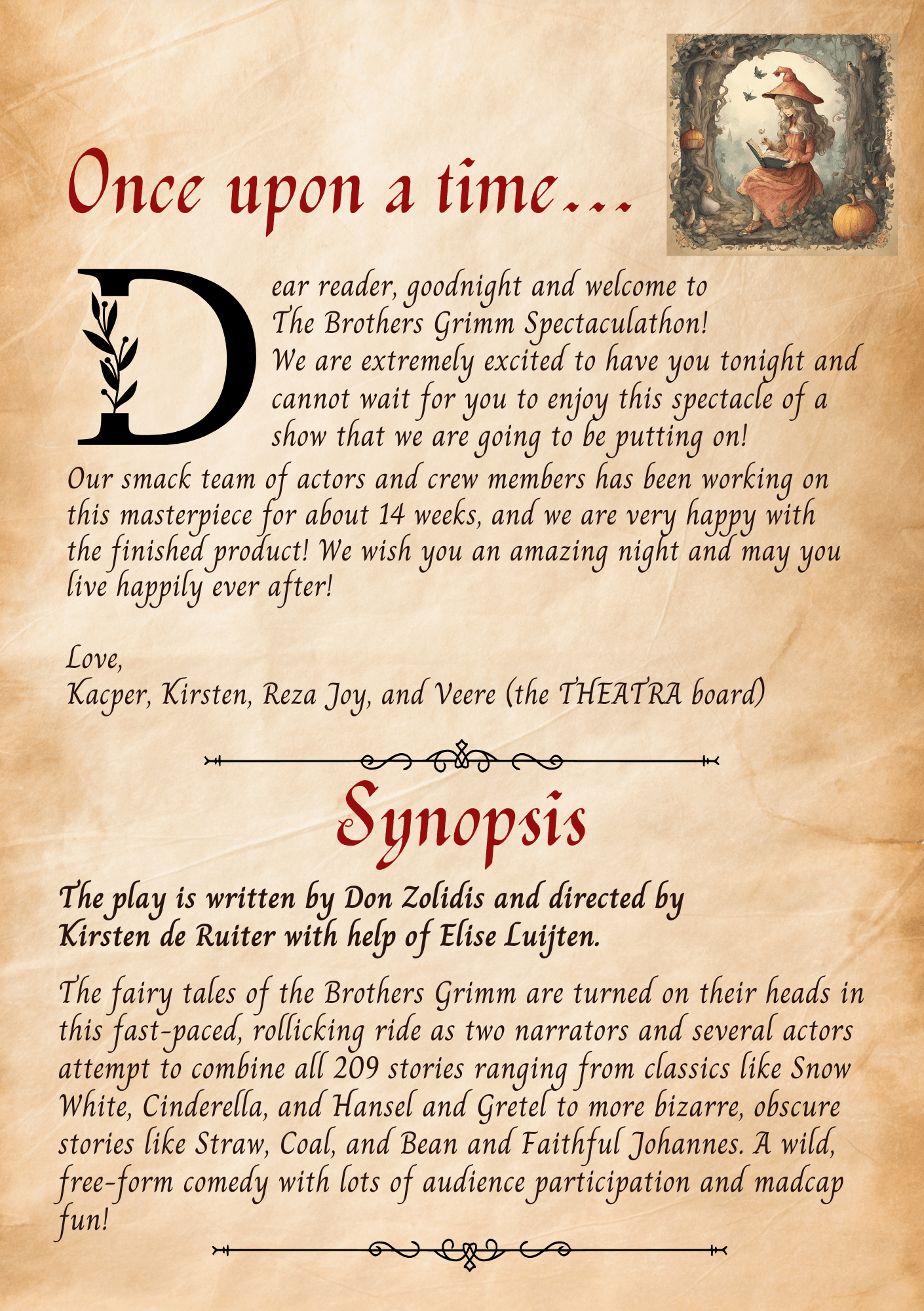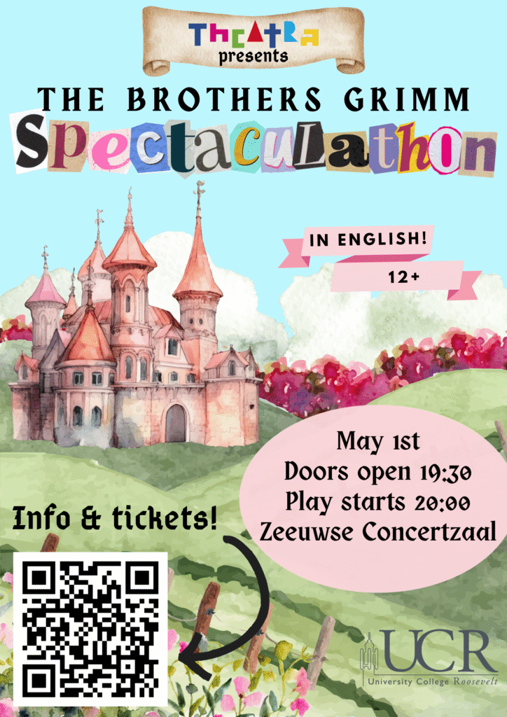 Het tweede stuk tijdens mijn bestuurjaar was The Brothers Grimm Spectaculathon, een chaotische voorstelling waarin bijna alle sprookjes van de gebroeders Grimm aan elkaar werden gepraat. Voor de poster van dit stuk ontwierp ik een sprookjesachtig tafereel.