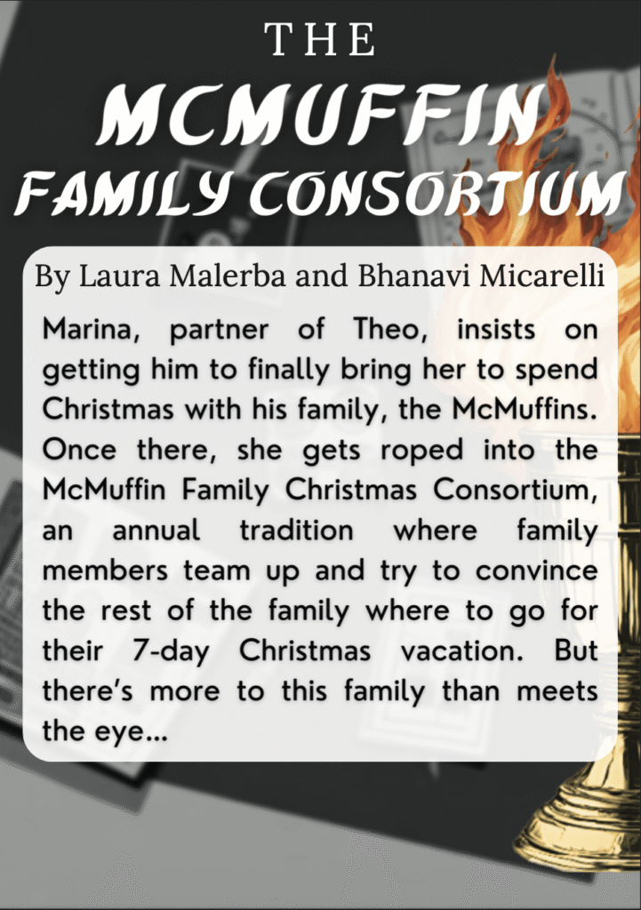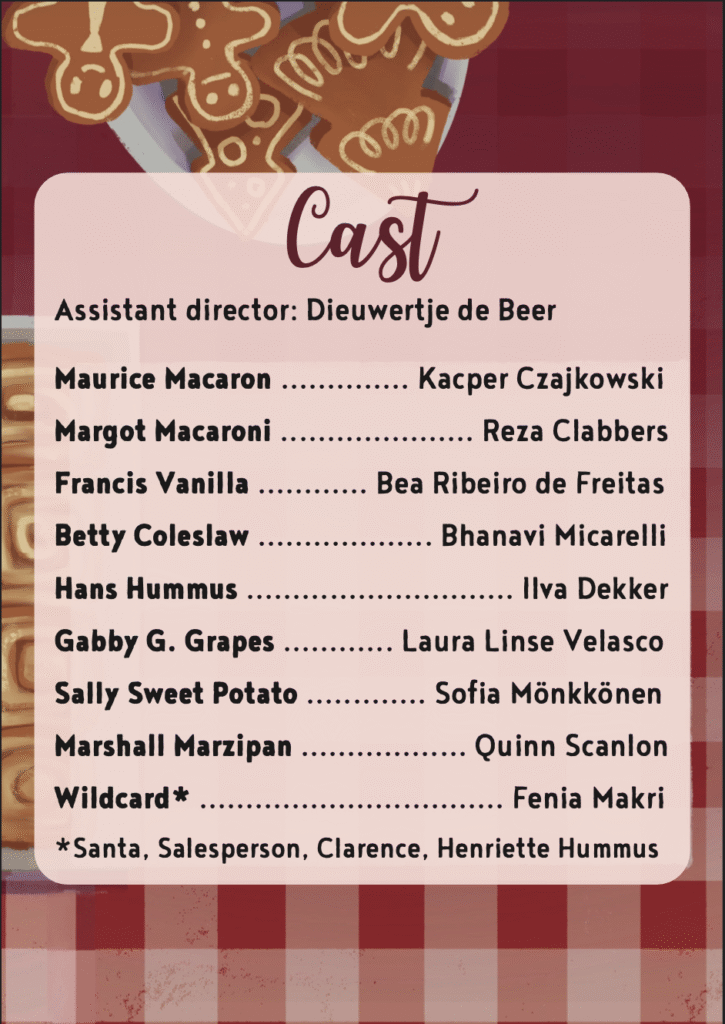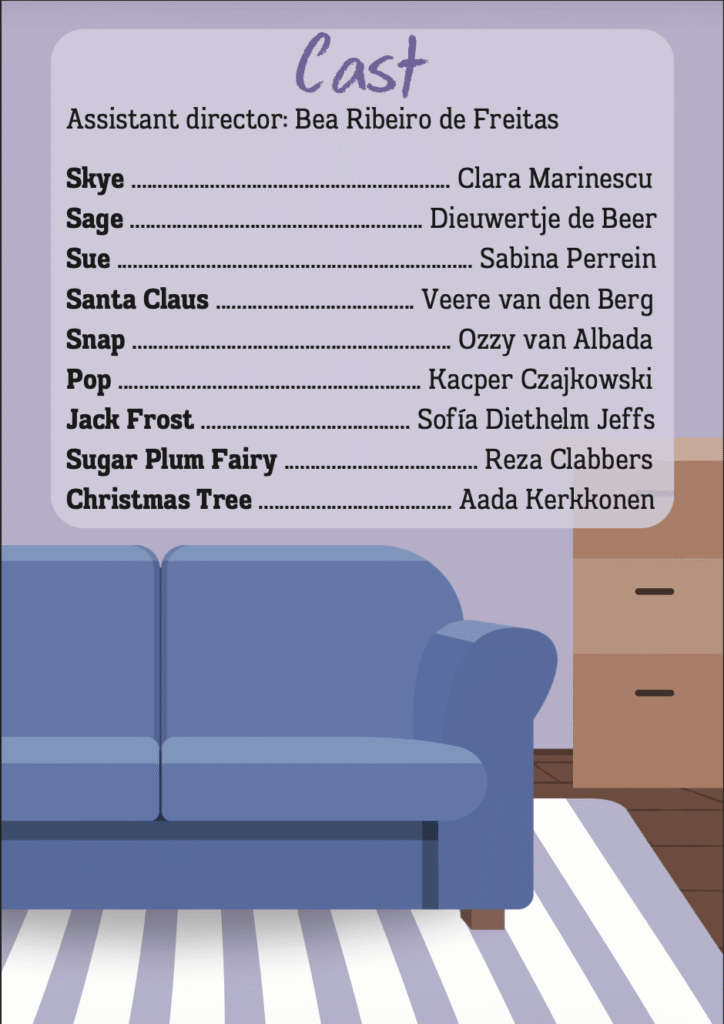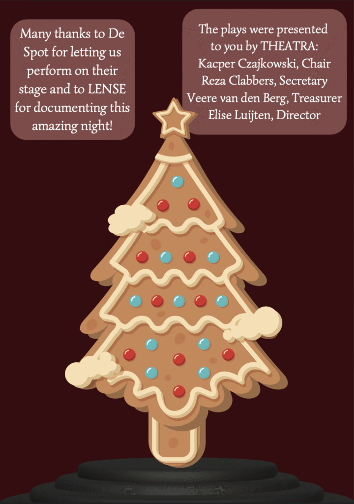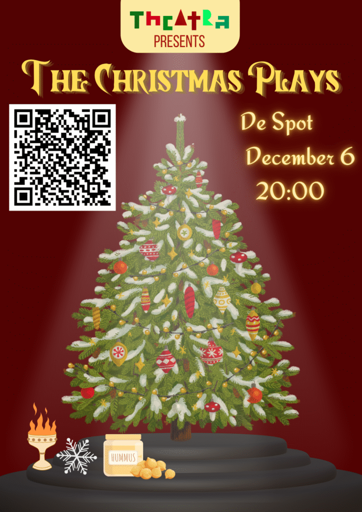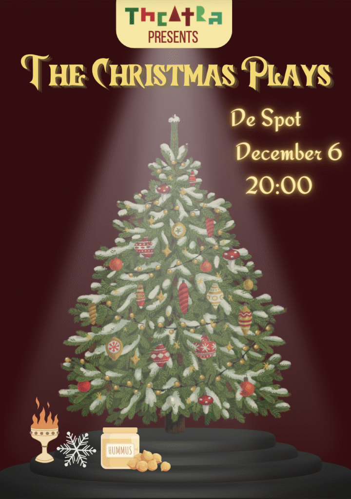 De eerste voorstellingen tijdens mijn bestuursjaar waren de Christmas Plays; 3 korte, door studenten geschreven, stukken rondom het kerst thema. Elk stuk wordt in de poster vertegenwoordigd door een symbool dat onder de boom staat. De poster heeft ook een horizontale versie die hierboven te zien is.