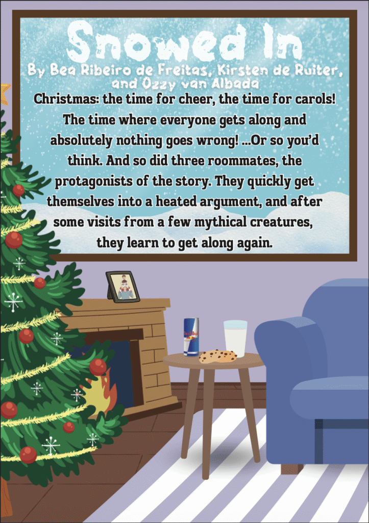 De boekjes voor deze voorstellingen hebben de posterafbeelding als voorkant (zonder QR code). Elk stuk heeft een bijpassend design op twee pagina’s. De pagina’s van Snowed In heb ik ontworpen, en ik heb de tekst layout toegevoegd bij alle pagina’s.