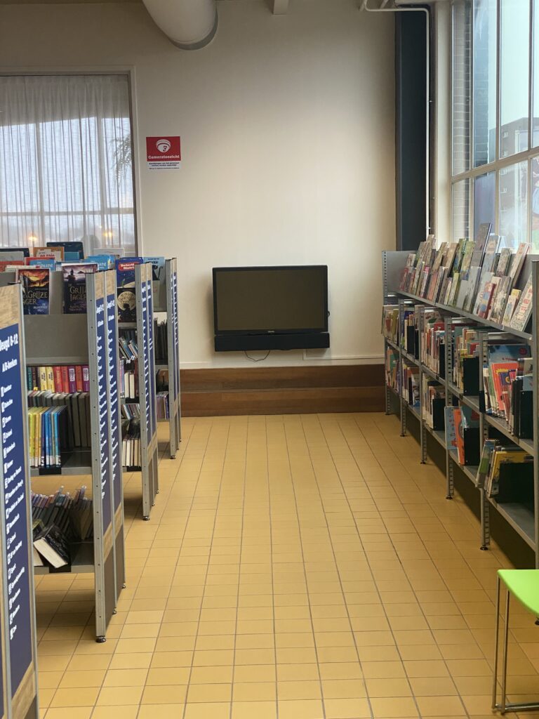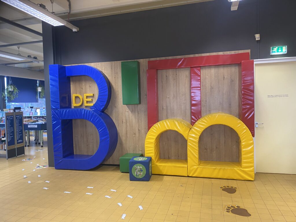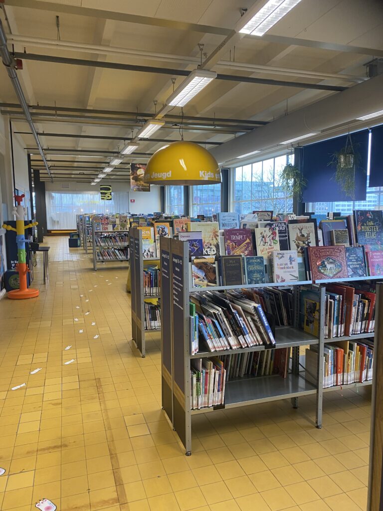 Na ons gesprek ben ik bij de bibliotheek in Zaandam langs geweest om te kijken hoe de jeugdafdeling er nu uitziet en om inspiratie op te doen. Ik vond een laaghangend scherm in de jeugdafdeling en een mooi hoekje voor het informatiepunt, dat zich naast de jeugdafdeling bevindt.