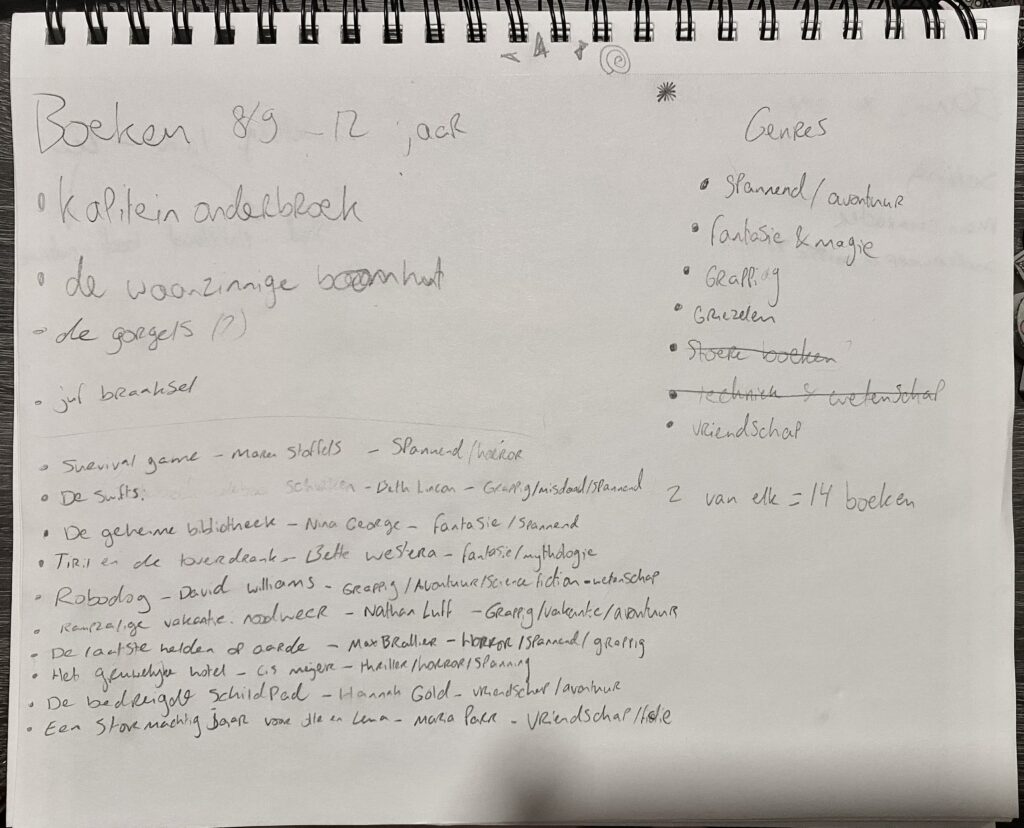 Om dit uit te werken ging ik op zoek naar kinderboeken. Ik besloot als doelgroep kinderen van 9-12 jaar te nemen. Zij zijn namelijk oud genoeg om zelfstandig het spel te spelen en dit is al een bestaande leeftijdscategorie voor de verdeling van kinderboeken. Eerst was ik zonder methode naar boeken aan het zoeken, maar dat was onhandig. Omdat ik graag diverse boeken wilde hebben, zodat het spel voor ieder kind aantrekkelijk is, heb ik bij de website van De Bibliotheek Jeugd gekeken naar de verschillende boekonderwerpen. Ik koos een aantal onderwerpen en ging op zoek naar 2 boeken per onderwerp, lettend op verschillende soorten verhalen en verschillende hoofdpersonen. Hoewel ik eerst ook van plan was de categorieën “stoere boeken” en “techniek en wetenschap” te gebruiken, besloot ik later dit toch niet te doen, omdat veel van de boeken al in andere categorieën terugkwamen. Zo heb ik uiteindelijk 10 boeken uitgekozen.