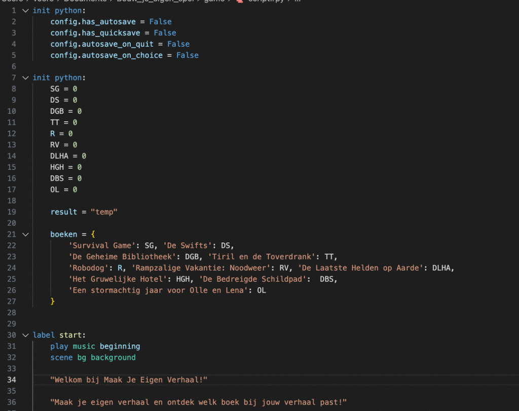 Het spel werkte bijna helemaal zoals ik wilde. Eén probleem waar ik tegenaan liep, was dat de boekvariabelen niet resetten wanneer het spel opnieuw werd gespeeld. Hierdoor kwam er vaak een verkeerd antwoord uit. Ik kon maar niet vinden waarom dit gebeurde: ik had de saves en autosaves al uitgezet, maar dit hielp niet. Ik besloot toen mijn probleem in de RenPy Subreddit te delen en kreeg al snel de juiste oplossing: ik maakte mijn variabelen in Python code, waardoor ze zich anders gedroegen dan normale variabelen. Dit had ik oorspronkelijk gedaan zodat ze in een dictionary konden staan waardoor gemakkelijk het boek met de meeste punten gevonden kon worden met de max() functie. Het bleek dat de dictionary helemaal niet in Python code geschreven hoefde te worden: probleem opgelost!
