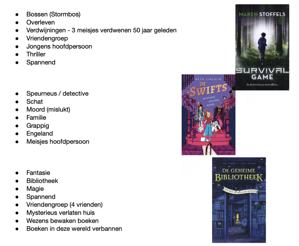 Om bij de keuzes in het spel het juiste boek te vinden was het belangrijk om verschillende waardes aan de vragen te koppelen. Ik vond het lastig om in te schatten wat kinderen het belangrijkst zouden vinden: setting, thema, of hoofdpersoon. Uiteindelijk besloot ik het thema als belangrijkste element te nemen, daarna de setting en als laatste de hoofdpersoon.