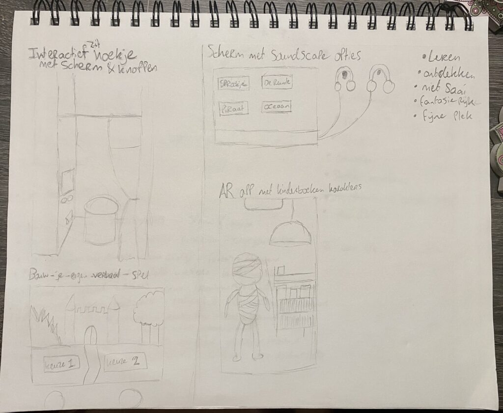 Ik had meteen een aantal ideeën. Als eerste bedacht ik een interactief zithoekje met een scherm en twee knoppen, waar kinderen door middel van een klein spel hun eigen verhaal kunnen bouwen en daarna een boek krijgen dat bij hun zelfgemaakte verhaal past. Als tweede had ik het idee om bij een scherm een zithoekje te creëren, met koptelefoons die verbonden zijn aan het scherm. Hiermee kunnen kinderen naar een aantal soundscapes luisteren terwijl ze een boek lezen. De soundscapes passen bij verschillende onderwerpen/genres zoals sprookjes (twinkelgeluiden), de ruimte (lancering raket), avontuur (zwaardgeluiden) en de oceaan (geluiden van een dolfijn). Als laatst dacht ik aan een Augmented Reality app waarmee kinderen in de bibliotheek verschillende karakters uit kinderboeken tot leven kunnen wekken en mogelijk een speurtocht kunnen doen.
