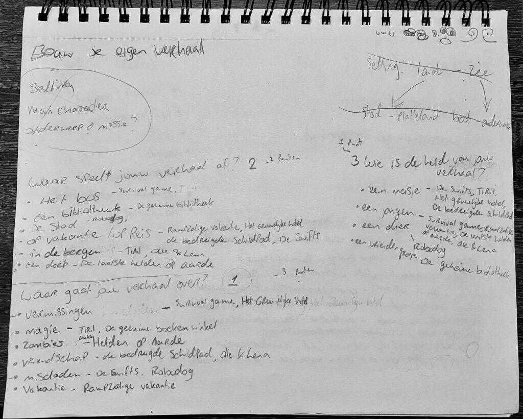 Voor deze 10 boeken schreef ik steekwoorden op over de locaties, thema’s, genres en hoofdpersonen van de verhalen. Hierna ging ik brainstormen over de werking van het spel. Ik was van plan een flowchart systeem te maken voor de keuzes in het spel, maar dat werd al snel te complex voor het idee dat ik erbij had.
